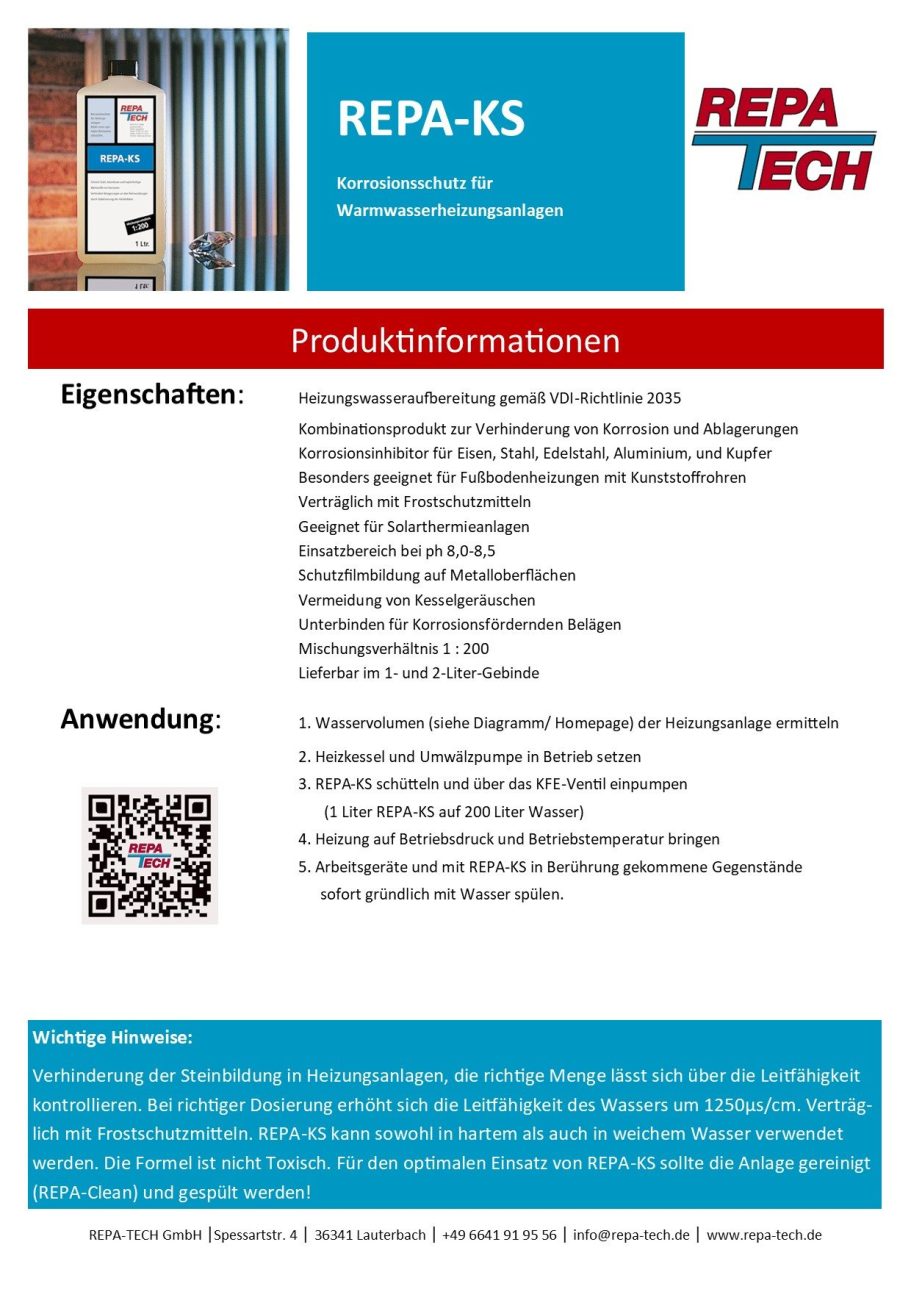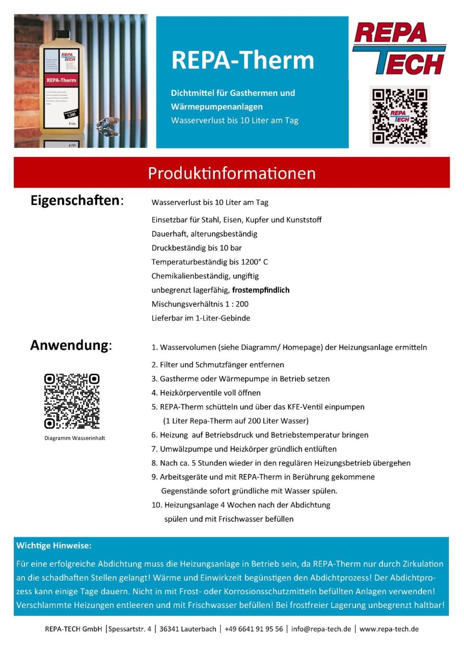 Dichtmittel für die Rohrleitung bei Kessel betriebenen Heizungsanlagen mit einem Wasserverlust bis zu 200 Liter am Tag. NICHT in Thermen- oder Wärmepumpenanlagen verweden, dafür verwenden Sie bitte REPA-THERM.